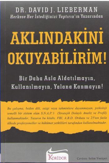Dakikalar içinde karsinizdaki insanin ne düsündügünü çözmeniz için kanitlanmis psikolojik taktikler..Hemen her durumda, herhangi bir kisiye kolayca uyarlanabilecek, belirgin, kanitlanmis ve pratik psikolojik teknikleri içermektedir.Dr. Lieberman, bu tekniklerin kolayligini ve tutarliligini yüzlerce televizyon ve radyo programinda sergiledi. FOX News ile çalisan program yapimcisi Jeff Rosin, söyle demisti: "Kesinlikle inanilmaz! Onun yanindaydim ve hiç yanildigini görmedim" Bir kez bile! Nasil yapilacagini ben bile ögrendim ve bu gerçekten önemli bir bulus." Aslinda, Dr. Lieberman, hassas yalan makineleriyle canli televizyon programlarinda yaristi ve berabere kaldi; hem de her seferinde!Aklindakini Okuyabilirim, gerçek yasam ortamlarinda birinin ne düsündügünü ve neler hissettigini anlamak için neler yapabileceginizi adim adim açikliyor. Örnegin, patronunuzun sizi gerçekten sevip sevmedigini, bir pazarlamacinin güvenilir olup olmadigini, biriyle ilk kez bulustugunuzda iliskinin istediginiz yönde mi, yoksa aksi yönde mi gittigini kesinlikle ve kolayca anlayabileceksiniz. Risk yüksek oldugunda "pazarliklar, sorusturmalar, taciz konulari, hirsizlik veya sahtekarlik" kendinize zaman, para, enerji kazandirmak ve hayal kirikligindan kurtulmak için kimin sizin tarafinizda, kimin karsinizda oldugunu kolayca fark etmeyi ögrenin.